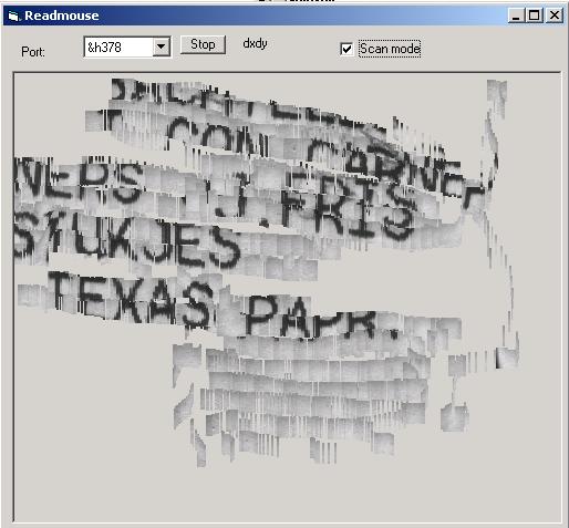 I can understand you can't wait to have such a handy scanner yourself. And now, you can! The software is downloadable here. The software works on mice which use an ADNS-2610 optical sensor, recognisable by the eight pins, the sun-like mark and the text 'A2610'. I've seen this sensor in most cheap optical mice that aren't too old. To hook it up, check out the pinout in the datasheet, then on the PCB cut the traces running from the sensors SCK- and SDIO-pins to the rest of the mouse. Then connect the sensor, using a diode, to a parallel port, like this: